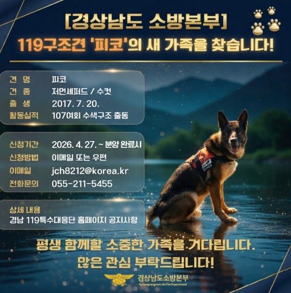 (포탈뉴스통신) 경상남도 소방본부는 각종 재난 현장에서 도민의 생명을 구하기 위해 활약해 온 119구조견 ‘피코’(저먼 셰퍼드, 29kg)가 6년간의 임무를 마치고 명예롭게 은퇴함에 따라, 제2의 견생을 함께할 가족을 찾고 있다고 밝혔다.