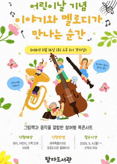 (포탈뉴스통신) 제주시 탐라도서관은 어린이날을 맞아 5월 16일 도서관 강의실에서 온 가족이 함께 즐길 수 있는 북콘서트 ‘이야기와 멜로디가 만나는 순간’을 개최한다.