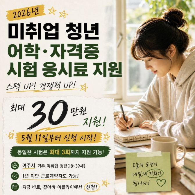 (포탈뉴스통신) 여주시는 오는 5월 11일부터 미취업 청년에 어학·자격시험 응시료를 지원하는 ‘경기청년 역량강화 기회지원’ 사업 접수를 시작한다.