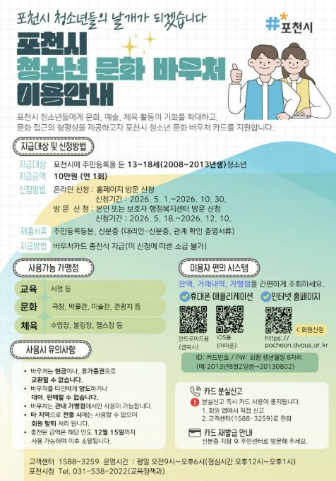 신청은 온라인과 방문 방식으로 가능하다. 온라인 신청은 2026년 5월 1일부터 10월 30일까지 포천시 청소년 문화 바우처 누리집에서 할 수 있으며, 방문 신청은 5월 18일부터 12월 10일까지 읍면동 행정복지센터에서 하면 된다.
