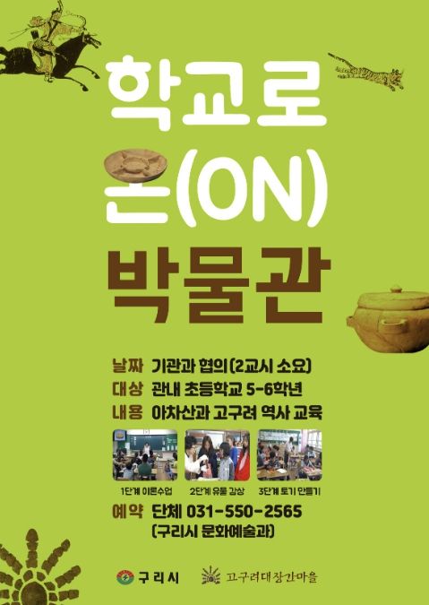(포탈뉴스통신) 구리시는 4월 28일부터 오는 9월까지 고구려 유물 상자를 들고 관내 초등학교를 찾아가는 ‘학교로 온(ON) 박물관’프로그램을 운영한다고 밝혔다.