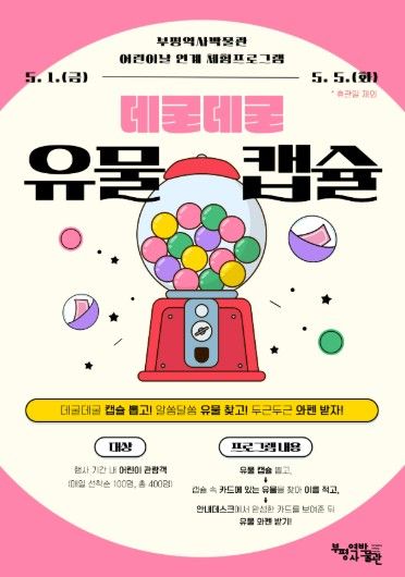 (포탈뉴스통신) 부평역사박물관은 어린이날을 맞아 5월 1일~5일(4일 휴관)까지 어린이와 가족 단위 관람객을 위한 체험 프로그램 ‘데굴데굴 유물 캡슐’을 운영한다.