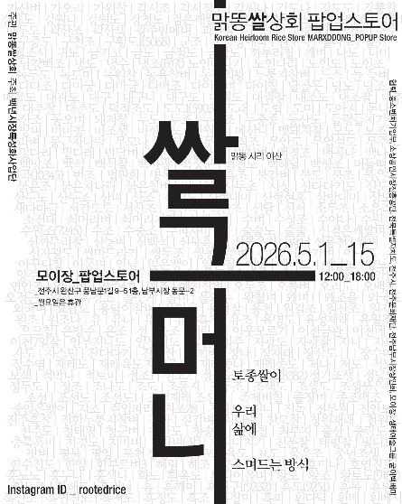 전주 남부시장 백년시장 육성사업단은 오는 5월 1일부터 15일까지 전주 남부시장 모이장 팝업스토어존에서 토종쌀 팝업스토어인 ‘쌀그머니–토종쌀이 우리 삶에 스며드는 방식’을 운영한다.
