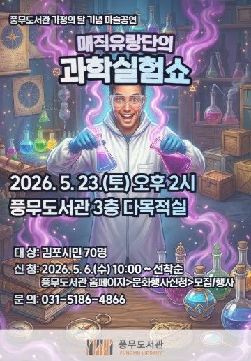 (포탈뉴스통신) 김포시 풍무도서관에서는 5월 23일 오후 2시부터 3시까지 마술공연 ‘매직유랑단의 과학실험쇼’를 운영한다. 가정의 달을 맞아 도서관 이용 가족에게 특별한 문화 향유 기회를 제공하고자 기획된 공연이다.