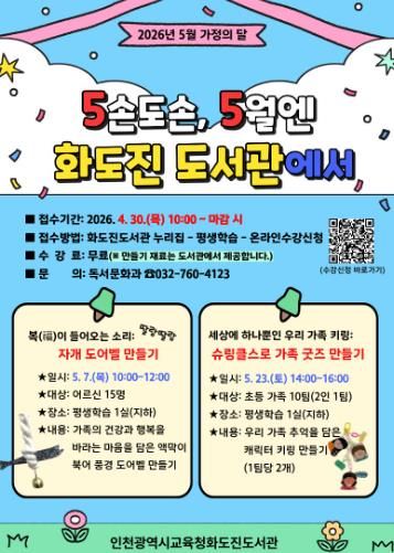 (포탈뉴스통신) 인천광역시교육청화도진도서관은 5월 가정의 달을 맞아 유·초등생 동반 가족과 어르신을 대상으로 세대 맞춤형 프로그램 ‘5손도손, 5월엔 화도진도서관에서’를 운영한다.