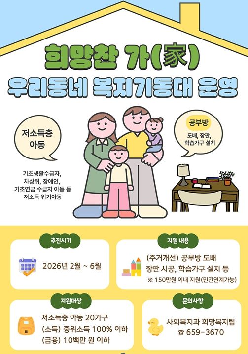 (포탈뉴스통신) 여수시는 저소득층 아동의 학습 여건 개선과 안전한 주거공간 조성을 위해 2026년 주거환경 개선사업 ‘희망찬 가(家)’를 추진한다고 밝혔다.