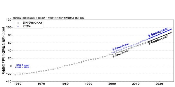 보고서에 따르면 우리나라의 2025년 이산화탄소 배경농도(432.7 ppm, 2024년 429.5 ppm)는 전지구 평균(425.6 ppm, 2024년 422.8 ppm)보다 7.1 ppm 높은 수준을 기록했다. 전년 대비 3.2 ppm 상승해 최근 10년(2015~2024) 기간 중 두 번째로 큰 연간 증가폭을 보였다. 또한, 우리나라에서 가장 오랜 기간(1999년~) 관측해 온 안면도 이산화탄소 관측 결과를 근거로 우리나라 이산화탄소 배경농도는 2000년 이후 연 2.5 ppm씩 높아지고 있고, 최근 10년에는 연 2.6 ppm의 속도로 증가하고 있다고 밝혔다. 아울러, 전지구 평균 증가 속도는 2000년 이후 연 2.3 ppm, 최근 10년 연 2.6 ppm이다.