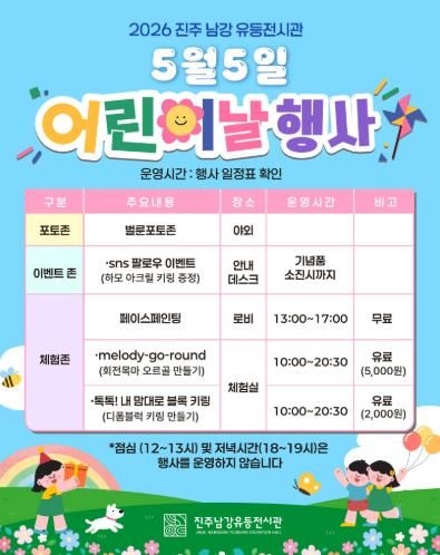 이번 어린이날 체험 행사는 진주시립이성자미술관, 진주익룡발자국전시관, 진주남강유등전시관 등 문화시설 사업소 산하의 시설에서 운영된다.