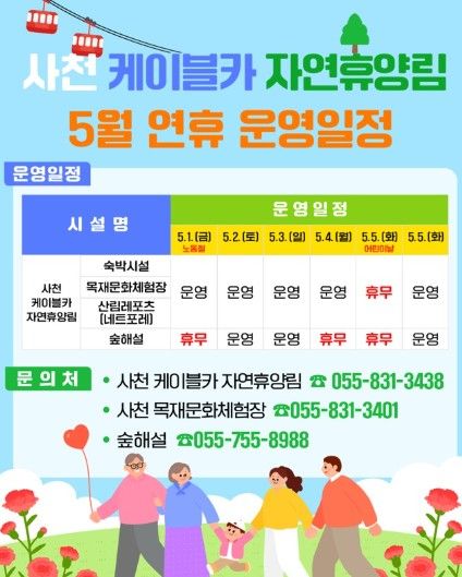 (포탈뉴스통신) 사천시는 5월 가정의 달과 어린이날을 포함한 연휴 기간을 맞아 사천케이블카 자연휴양림의 이용객 편의를 위한 시설별 5월 연휴 운영 계획을 안내했다.