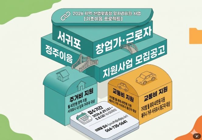 (포탈뉴스통신) 제주특별자치도와 제주콘텐츠진흥원(원장 강민부)은 고용노동부와 함께 서귀포시 창업 생태계 활성화와 우수 인력의 안정적인 지역 정착을 위해 '2026 서귀포 창업가·근로자 정주이음 지원사업' 참여자를 모집한다.