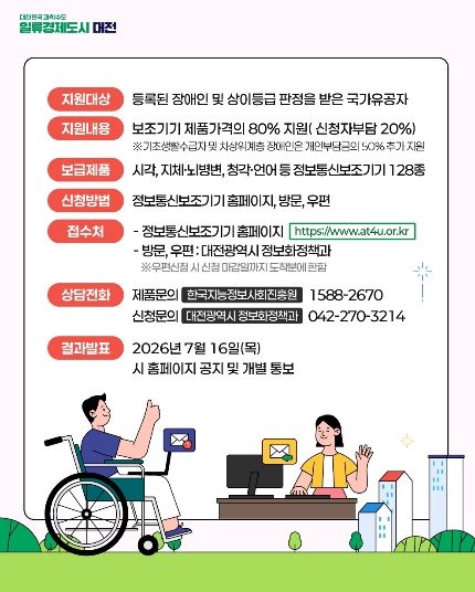 신청 기간은 5월 7일부터 6월 23일까지이며, 정보통신보조기기 누리집을 통한 온라인 접수 또는 대전시청 정보화정책과 방문 및 우편 접수로 신청할 수 있다. (자세한 내용은 대전시 누리집 참고)