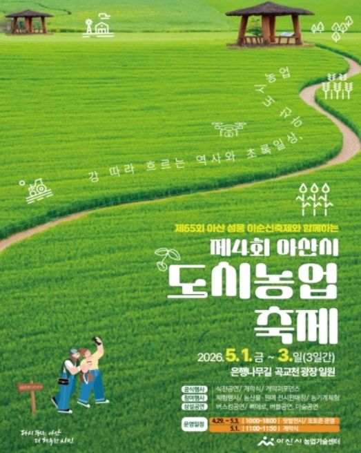 (포탈뉴스통신) 아산시는 ‘제65회 아산 성웅 이순신축제’와 연계한 ‘제4회 아산시 도시농업축제’를 오는 5월 1일부터 3일까지 3일간 은행나무길 곡교천 광장 일원에서 개최한다.