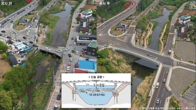 시는 이 문제를 해결하고자 고기교를 길이 46.4m, 폭 20m 4차로로 확장한다. 고기교 일대가 상습 침수 구역인 점을 고려해 교량 높이도 3.1m 더 높인다.