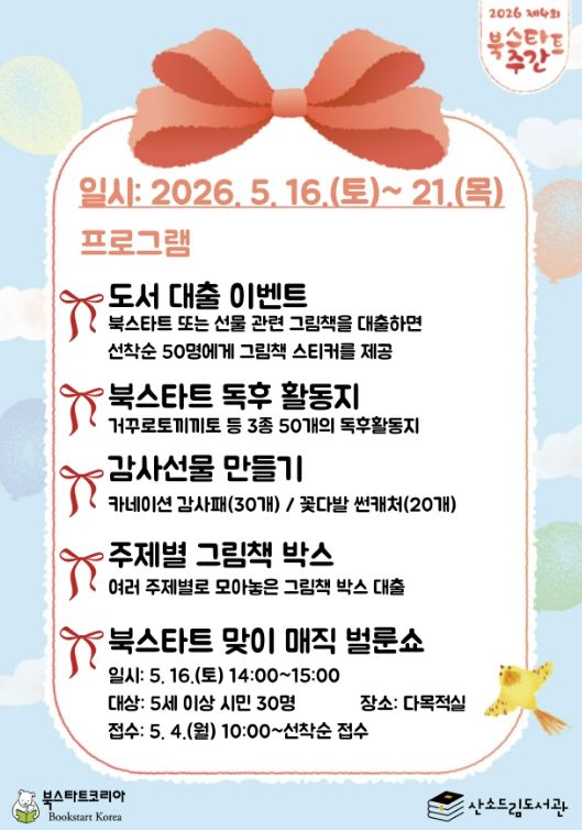 (포탈뉴스통신) 태백시 산소드림도서관은 2026년 북스타트 주간 지원사업 공모에 선정되어 ‘선물’을 주제로 오는 5월 16일부터 5월 21일까지 북스타트 주간을 운영한다.