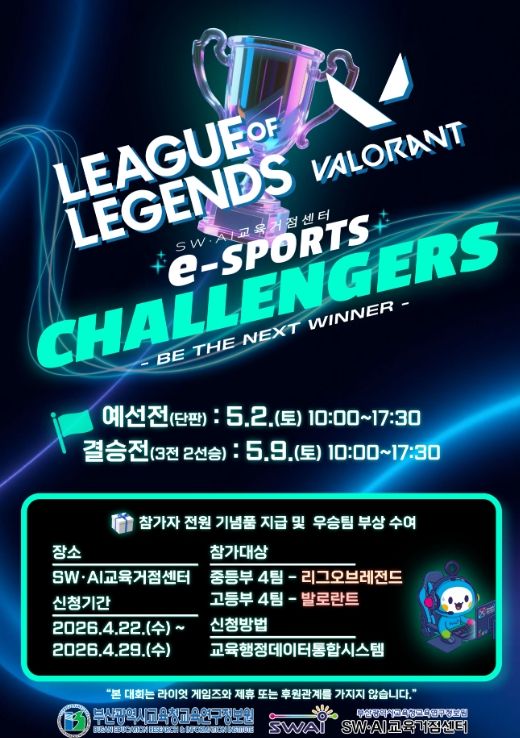 대회는 학생들에게 높은 관심을 받고 있는 ‘리그 오브 레전드’(중등부)와 ‘발로란트’(고등부) 2개 종목으로 운영된다. 예선은 단판 토너먼트 방식으로 진행하며, 결승은 3판 2선승제로 치러진다.