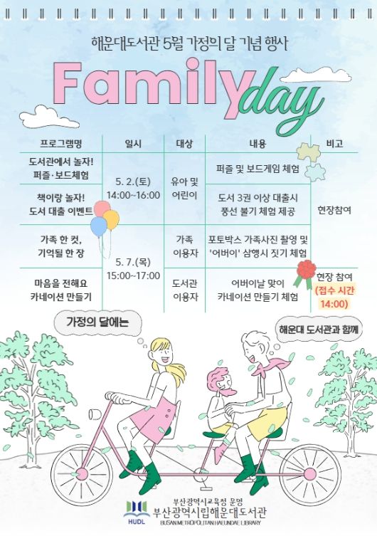 (포탈뉴스통신) 부산광역시립해운대도서관은 오는 5월 2일과 7일 해운대도서관 로비에서 어린이와 가족 이용자를 대상으로 ‘가정의 달 기념행사’를 운영한다.