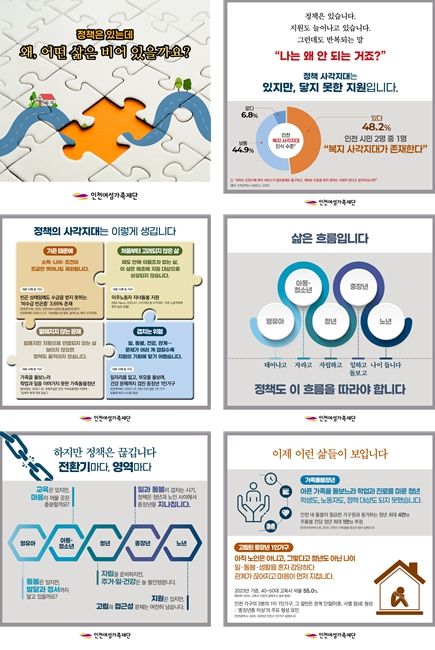 (포탈뉴스통신) 인천여성가족재단은 생애주기별 정책 사각지대 해소를 위해 2025년 수행한 연구보고서 '인천광역시 생애주기별 사각지대 지원 강화 방안 연구'를 바탕으로 카드뉴스를 제작·배포했다.