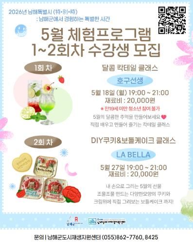 (포탈뉴스통신) 남해군 도시재생지원센터가 신록이 짙어가는 5월을 맞아, 군민들에게 일상 속 특별한 미식 경험과 힐링을 선사할 ‘5월 쿠킹클래스’를 마련하고 수강생 모집에 나선다.