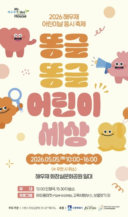(포탈뉴스통신) ‘2026 해우재 어린이날 똥시 축제-똥글똥글 어린이 세상’이 5월 5일 오전 10시부터 오후 4시까지 해우재 화장실문화공원 일원에서 열린다.