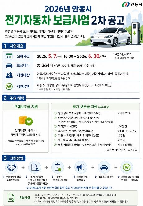 (포탈뉴스통신) 안동시는 최근 지속되는 고유가 현상에 선제적으로 대응하고 시민의 전기자동차 구매 수요를 충족하고자, 당초 7월로 예정됐던 2차 보급 사업을 5월로 앞당겨 추진한다고 4월 30일 밝혔다. 시는 이번 조기 시행을 통해 친환경 무공해 자동차 보급을 가속화하고 시민들의 경제적 부담을 완화할 방침이다.