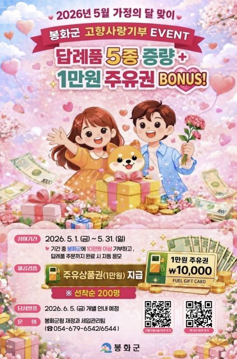 (포탈뉴스통신) 봉화군은 5월 가정의 달을 맞이하여 고향사랑기부제 활성화를 위해 5월 1일부터 31일까지 1개월간 “답례품 UP ! 주유권 BONUS !”란 주제로 고향사랑기부제 경품 이벤트를 진행한다.