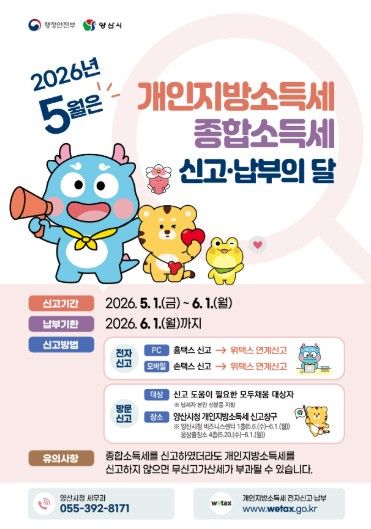 양산시는‘2026년 개인지방소득세·종합소득세 합동신고창구’를 양산비즈니스센터와 양산세무서에서 5월 6일부터 6월 1일까지, 웅상출장소에서는 5월 20일부터 6월 1일까지 운영한다.