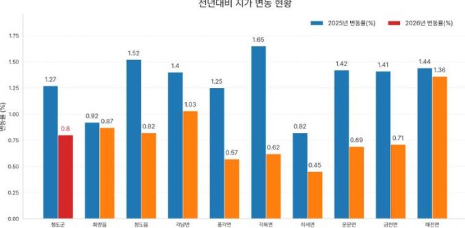 이 가운데 군 평균 변동률을 웃도는 지역은 4곳으로 매전면(1.36%), 각남면(1.03%), 화양읍(0.87%), 청도읍(0.82%) 순으로 나타났다.