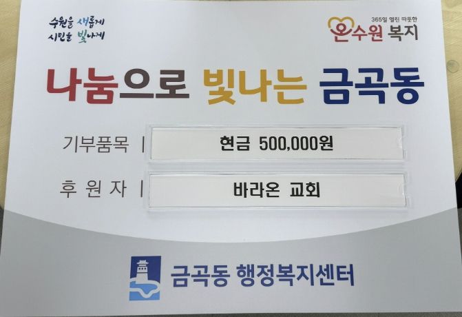 장성임 동장은 “지역을 위해 따뜻한 나눔을 실천해 주신 바라온교회에 깊이 감사드린다”며, “행정복지센터에서도 소중한 마음이 잘 전달될 수 있도록 최선을 다하겠다”고 말했다.