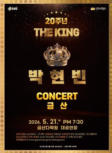 (포탈뉴스통신) 금산다락원은 대한민국 트로트계를 대표하는 가수 박현빈의 데뷔 20주년을 기념한 콘서트 ‘더 킹(THE KING)’을 오는 5월 21일 오후 7시 30분 금산다락원 생명의 집 대공연장에서 개최한다.