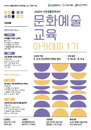 (포탈뉴스통신) 인천시 남동문화재단 서창생활문화센터는 오는 5월 18일부터 8월 5일까지 ‘2026년 서창생활문화센터 문화예술 교육 아카데미 1기’를 운영한다고 30일 전했다.