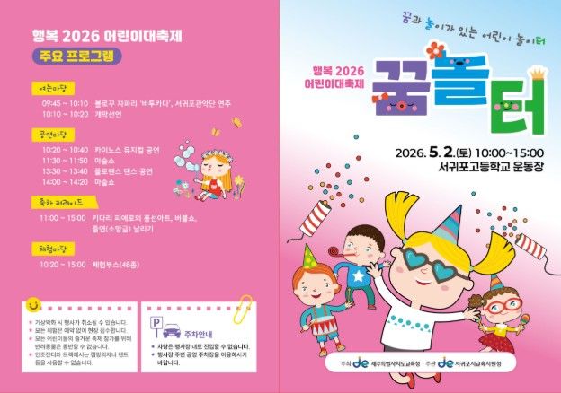 같은 날 서귀포시교육지원청은 서귀포고등학교에서 ‘행복 2026 어린이대축제’를 개최하여 뮤지컬과 마술쇼 등 공연과 축하 퍼레이드, 48개의 체험 부스 운영을 통해 대규모 어린이 축제의 장을 마련한다.