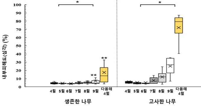연구진은 내부 수분 상태를 정밀 진단할 수 있는 전기저항단층촬영 기법을 통해 산불 직후인 4월에는 생존목과 피해목 간의 뚜렷한 차이가 없음을 확인했다. 그러나 7월 이후부터는 수분과 양분의 이동 통로가 막히며 내부 피해도가 빠르게 증가하고 점차 고사하는 경향을 보였다.