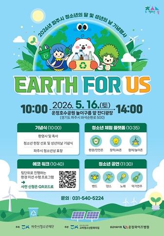 (포탈뉴스통신) 파주시청소년재단 교하청소년문화의집에서는 청소년의 건강한 성장과 성년의 의미를 되새기기 위해 2026년 5월 16일 '청소년의 달 및 성년의 날 기념행사 ‘EARTH FOR US’'를 개최한다.