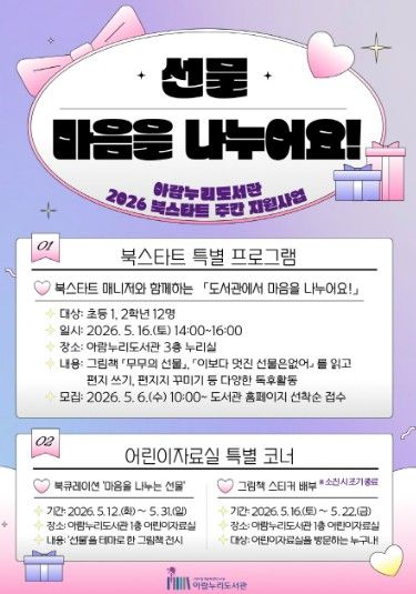 북스타트 주간 프로그램으로 오는 5월 16일 오후 2시, 초등학교 1·2학년을 대상으로 북스타트 매니저와 함께하는 ‘도서관에서 마음을 나누어요!’가 진행된다. 어린이들은 선정 도서인 '무무의 선물'과 '이보다 멋진 선물은 없어'를 함께 읽으며 나눔과 배려의 의미를 배운다. 또 소중한 사람에게 전할 감사 편지를 직접 쓰고, 꾸미는 독후활동으로 마음을 표현하는 시간을 가질 예정이다.