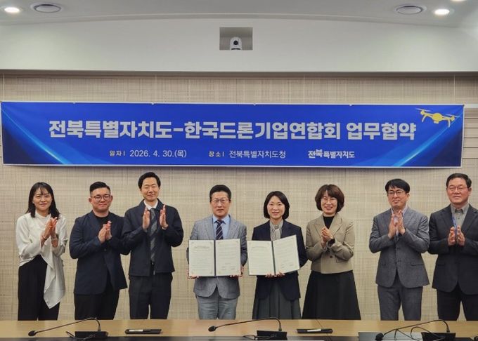 도는 30일 도청 영상회의실에서 한국드론기업연합회와‘전북형 AI 드론 산업 육성을 위한 업무협약(MOU)’을 체결하고 기업 육성과 산업 기반 구축에 공동 대응하기로 했다.