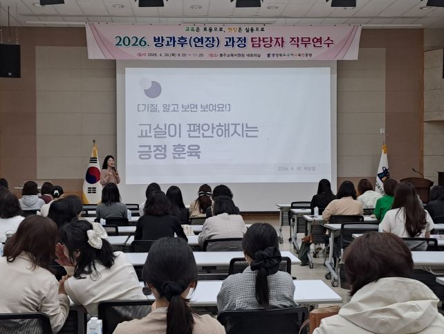 (포탈뉴스통신) 충청북도교육청 직속기관 유아교육진흥원(원장 박연숙)은 30일, 충주교육지원청 대회의실에서 도내 유치원‧어린이집 방과후(연장) 과정 담당자를 대상으로 '2026. 방과후(연장) 과정 담당자 직무연수'를 운영했다.