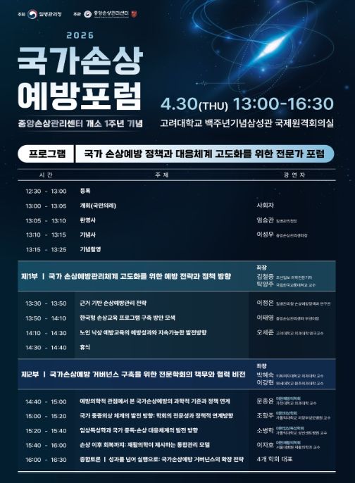 (포탈뉴스통신) 질병관리청은 중앙손상관리센터 개소 1주년을 맞아 4월 30일 고려대학교 백주년기념삼성관에서 「2026년 국가손상예방포럼」을 개최한다.