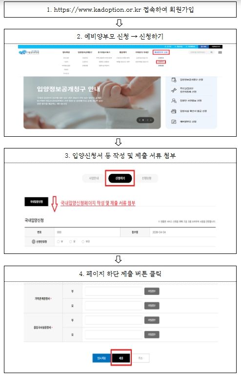 앞으로는 입양을 신청할 때 직접 방문하지 않아도 이번에 개통되는 시스템을 통해 예비양부모는 집에서 ▲입양신청 접수, ▲ 신청구비서류 제출, ▲단계별 진행상황 확인 등을 온라인으로 간편하게 처리할 수 있게 된다.