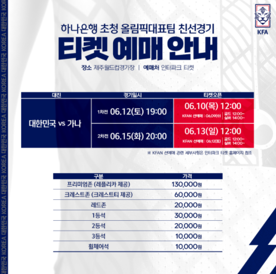 (포탈뉴스) 대한축구협회는 오는 12일과 15일 제주월드컵경기장에서 가나와 맞붙는 '하나은행 초청 올림픽대표팀 친선경기' 입장권을 9일부터 순차적으로 판매한다고 7일 밝혔다.
