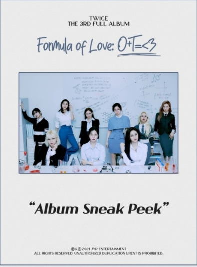 (포탈뉴스) 오는 12일 트와이스의 새 정규 앨범 '포뮬러 오브 러브: O+T=<3(Formula of Love)'가 발매된다. 지난해 10월 정규 2집 '아이즈 와이드 오픈(Eyes wide open)' 이후 약 1년 반 만에 발매하는 신보다.