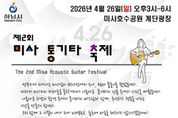 (포탈뉴스통신) 하남시 지역 예술인들이 참여하는 '제2회 미사통기타축제'가 오는 4월 26일 오후 3시부터 미사호수공원 계단광장에서 개최된다. 이번 행사는 통기타 음악과 대중음악을 통해 시민들과 소통하고, 지역 문화예술 활성화를 도모하기 위해 마련됐다. 약 3시간 동안 진행되는 본 공연에서는 다양한 통기타 가수와 공연팀이 참여해 총 29곡의 음악을 선보일 예정이다. 행사는 오후 3시 개회 및 내빈소개를 시작으로, 다채로운 통기타 공연이 이어진다. 특히 인기 팝송과 추억의 가요 공연, 협연 무대 등이 준비되어 있어 시민들에게 풍성한 볼거리를 제공할 것으로 기대된다. 또한 마지막에는 경품추첨과 함께 축제가 마무리된다. 이번 축제에는 34명의 연주자가 참여하며, 지역 음악인들은 물론 통기타 가수의 출연으로 시민들과 함께 호흡하는 공연으로 꾸며진다. 하남뮤직캠프 김남수 대표는 “이번 축제를 통해 시민들이 일상 속에서 음악을 즐기고, 미사의 통기타 문화가 전국 통기타의 중심지로 부상하는 계기가 될 것으로 기대한다”고 전했다. [뉴스출처 : 경기도 하남시]