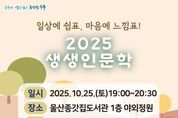 (포탈뉴스통신) 울산 중구에서 운영하는 울산종갓집도서관이 오는 10월 25일 오후 7시 울산종갓집도서관 1층 야외정원에서 지역 주민과 함께하는 2025년 생생인문학 행사를 개최한다. 2025년 생생인문학 행사는 ‘일상에 쉼표, 마음에 느낌표’라는 주제로, 기존의 명사 초청 특강 형식에서 벗어나 동화 구연과 클래식 공연을 결합한 특별한 문화 프로그램 형태로 진행된다. 이번 행사에서는 『완벽한 아이 팔아요』, 『마음여행』, 『파닥파닥 해바라기』, 『오늘상회』,『작은 빛 하나가』 등 따뜻한 울림을 담은 다양한 그림책이 소개된다. 이와 함께 영화 삽입곡으로 잘 알려진 'Moon river', 'A whole new world'와 프랑스 대중가요 'Je te veux' 등 그림책의 내용과 어울리는 아름다운 피아노·바이올린·첼로 연주가 풍성하게 펼쳐진다. 이번 행사에는 지역 주민 누구나 참여 가능하다. 참여를 희망하는 주민은 울산 중구 통합도서관 누리집을 통해 신청하면 된다. 울산종갓집도서관 관계자는 “이번 행사가 아이들에게는 꿈과 상상력을 키우고 어른들에게는 동심을 떠올리는 시간이