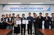 (포탈뉴스통신) 제주테크노파크(원장 지영흔,제주TP)와 공공과학기술연구노동조합 제주TP지부(위원장 최연택, 지부장 권철만)이 화합과 신뢰를 바탕으로 한 ‘단체협약’을 체결하며, 상생적 노사관계 정착과 지역 혁신성장의 동반자로서 공동 발전을 다짐했다. 제주TP는 8일 오후 제주벤처마루에서 지영흔 제주TP 원장과 최연택 공공과학기술연구노동조합 위원장 등 노사 관계자들이 참석한 가운데 단체협약 체결식을 진행했다고 밝혔다. 이번 협약은 지난 2024년 11월 발표된 ‘노사 상생협력 공동선언’ 이후, 약 1년간 수차례의 본교섭과 실무협의를 거쳐 이끌어낸 결실이다. 양측은 총 141개 조항에 대한 최종 합의를 도출하며 성숙한 노사관계 정착에 뜻을 모았다. 주요 합의 내용은 조합원의 근로조건 개선과 권익 보호를 위한 제도적 기반마련에 초점을 맞췄다. 구체적으로는 ▲인사 및 징계 등에 대한 조직 공정성 확립 ▲원활한 노동조합 활동 보장 ▲고용안정 및 적정인력 확보 노력 ▲일·가정 양립 지원 강화 등이 포함됐다. 제주TP와 노동조합은 이번 단체협약을 통해 안정적인 조직 운영을 위한 제도적 토대를 마련했다. 이는 향