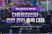(포탈뉴스통신) 방탄소년단(BTS) 컴백 행사 다중운집인파 안전 관리 총력 대응 - BTS 컴백 행사 인파 안전관리 관계기관 대책회의 '26.3.11.(수) 개최 ▲ 행정안전부 - 다중운집인파 재난 위기경보 '주의' 단계 발령 일시: 3.21.(토) 00:00~24:00 / 지역: 서울 종로구·중구 - '정부합동안전점검단' 구성, 안전관리 실태 사전 점검 ▲ 문화체육관광부 - 공연 안전을 위한 자문 및 무대시설·객석 점검 ▲ 보건복지부 응급 환자 발생 대비, 재난의료지원팀(DMAT) 및 보건소 신속대응반 출동체계 사전 구축 ▲ 경찰·소방 - 행사장 주변 질서 유지 및 치안 확보, 대테러 방지 활동 - 구조·구급요원·구급차 현장 배치 ▲ 서울시 - 시민안전대책본부 가동, 안전관리계획 이행 여부 확인 - 안전 안내 문자 발송 및 질서 있는 관람 유도 [뉴스출처 : 행정안전부]