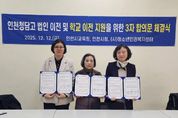 (포탈뉴스통신) 인천광역시교육청은 12일 인천시청, 사단법인 청소년인권복지센터 내일과 함께 인천청담고등학교의 법인 이전 및 학교 이전 지원을 위한 3자 합의를 체결했다. 이번 합의에는 인천청담고등학교의 법인을 현 법인인 청소년인권복지센터 내일에서 가톨릭아동청소년재단으로 이전하고, 이전을 2026년 2월 28일까지 완료한다는 내용이 담겼다. 또한 인천시청은 이전에 필요한 행정절차를 지원하고, 인천시교육청은 2026학년도 학사 운영이 안정적으로 이루어지도록 교육·행정 지원을 추진하기로 했다. 도성훈 교육감은 “이번 합의는 학생들의 학습권 보호와 학교 운영의 안정성을 고려해 기관 간 역할을 명확히 한 것”이라며 “학교 이전과 법인 변경이 원활히 진행될 수 있도록 지원하겠다”고 말했다. [뉴스출처 : 인천광역시교육청,]