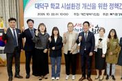 (포탈뉴스통신) 대전시의회는 22일 시의회 소통실에서 ‘대덕구 학교 시설환경 개선을 위한 정책간담회’를 개최했다. 이번 간담회는 작년에 이어 대덕구 지역의 학교 시설에 대한 개선 조치 사항을 점검하고 개ㆍ보수 및 정비가 필요한 시설에 대한 제도적인 보완 방안을 논의하고자 마련됐다. 간담회는 이효성 의원(국민의힘, 대덕구1)이 좌장을 맡아 진행하고, 대덕구 학부모 8명과 백승영 대전광역시교육청 시설과장, 김종희 대전광역시동부교육지원청 시설지원과장이 참석해 학교별 현안을 심도있게 다뤘다. 간담회에 참석한 학부모들은 △운동장 부대시설 개ㆍ보수, △교실 노후 바닥 교체 및 계단 안전바 보강, △급식실 누수 공사, △통학로 환경 정비 등의 필요성을 설명하고, 시와 교육청 차원의 신속한 사업 추진을 요청했다. 이효성 의원은 “학교는 단순한 학습공간이 아닌, 교육의 질과 학생의 안전, 행복한 성장을 좌우하는 삶의 중심 공간으로, 시설 개선은 미래 세대를 위한 교육 투자의 핵심 과제”라고 설명하며 학교 교육환경의 중요성을 강조했다. 또한, “학교가 보다 안전하고 쾌적한 공간으로 거듭날 수 있도록, 모