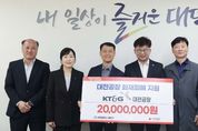 (포탈뉴스통신) 대전 대덕구는 21일 문평동 공장화재 피해 주민 지원을 위해 KT&G 대전공장(공장장 장재홍)으로부터 성금 2000만원을 기탁받았다고 밝혔다. 이번 성금은 지난 3월 20일 발생한 대덕구 문평동 공장화재로 피해를 입은 주민들을 지원하기 위해 마련됐다. 기탁된 성금은 대전사회복지공동모금회를 통해 전달되며, 화재로 어려움을 겪고 있는 피해 주민들의 생활 안정과 회복 지원에 사용될 예정이다. 장재홍 공장장은 “예기치 못한 화재로 어려움을 겪고 있는 주민들에게 조금이나마 힘이 되기를 바라는 마음으로 성금을 전달했다”며 “앞으로도 지역사회와 함께하는 나눔 활동을 지속해 나가겠다”고 밝혔다. 대덕구 관계자는 “어려운 상황에 놓인 우리 지역의 이웃을 위해 큰 나눔을 실천해 주신 KT&G 대전공장에 깊이 감사드린다”며 “소중한 성금이 피해 주민들에게 실질적인 도움이 될 수 있도록 최선을 다하겠다”고 말했다. 한편, KT&G 대전공장은 임직원들이 자발적으로 참여하는 사회공헌기금 ‘상상펀드’를 통해 지속적인 나눔 활동을 이어오고 있다. 상상펀드는 임직원이 매월 급여의 일정 금