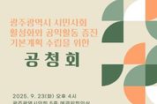 (포탈뉴스통신) 광주광역시는 23일 오후 4시 광주광역시의회 5층 예결위회의실에서 ‘광주광역시 시민사회 활성화와 공익활동 증진을 위한 기본계획(제1차, 2026~2028)’ 최종보고회 겸 공청회를 개최한다. 광주시가 주최하고 광주시민사회지원센터가 주관하는 이번 공청회는 향후 3년간 광주 시민사회의 지속가능한 발전을 위한 정책방향을 최종 확정하기 전 시민사회 현장의 의견을 수렴하기 위해 마련됐다. 광주시는 2023년 ‘광주광역시 시민사회 활성화와 공익활동 증진 조례’를 제정하고, 2024년 7월 기존 ‘광주NGO지원센터’를 ‘광주시민사회지원센터’로 전환하며 시민사회 지원 기반을 확대했다. 올해는 전문가-행정-센터가 참여하는 ‘기본계획수립 전담팀(TF)’을 구성해 본격적인 연구에 착수했다. 전담팀(TF)은 지난 4월부터 수차례 논의와 자문을 거쳐 기본계획의 기틀을 마련했으며, 시민 및 시민사회 설문조사, 활동가 직급별 포커스그룹인터뷰(FGI) 결과를 반영해 비전과 목표, 추진전략을 구체화했다. 이번에 공개되는 기본계획은 ▲시민사회 기반과 역량 강화 ▲시민참여와 활동가 저변 확대 ▲공익활동에 의한 공동체