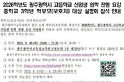 (포탈뉴스통신) 광주시교육청은 오는 30일 오후 7시 광주시교육청교육연구정보원 대강당에서 중학교 3학년 학생과 학부모를 대상으로 ‘고입 전형요강 설명회’를 개최한다. 이번 설명회는 고등학교 입학을 앞둔 학생·학부모의 궁금증을 해소하고, 진로·진학 선택에 도움을 주기 위해 마련됐다. 설명회에서는 ▲자율형공립고 ▲과학중점학교 ▲전기고(마이스터고・특성화고・특목고・예술고·체육고 등) ▲후기 일반고 전형요강 등을 안내하고 질의응답을 진행한다. 설명회 참여 신청은 오는 23일까지 온라인'으로 하면 된다. 현장 접수도 가능하며, 행사에 참석하지 못하는 학부모를 위해 시교육청 유튜브 채널을 통해 실시간 중계할 예정이다. 올해 고등학교 원서 접수는 ▲10월 20일 산업수요맞춤형고(마이스터고) 및 광주형마이스터고 ▲10월 21일 광주예술고 ▲11월 3일 광주체육고 ▲11월 24일 특성화고 ▲12월 16일 자율형공립고, 과학중점고를 포함한 평준화 일반고 등 순으로 시작된다. 평준화 일반고 합격자 발표는 2026년 1월 8일이며, 배정 발표는 1월 22일 이뤄진다. 또 학교장이 직접 학생을 선발