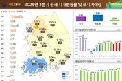 (포탈뉴스통신) 국토교통부와 한국부동산원(원장 손태락)은 '25년 3분기 지가변동률 및 토지거래량을 발표했다. ★ 지가변동률 '25년 3분기 전국 지가는 0.58% 상승했다. 상승폭은 '25년 2분기(0.55%) 대비 0.03%p 확대, '24년 3분기(0.59%) 대비 0.01%p 축소된 것으로 나타났다. '25년 9월 지가변동률은 0.20%로, '25년 8월(0.19%) 대비 0.01%p, '24년 9월(0.19%) 대비 0.01%p 높은 수준으로 나타났다. (지역별) '25년 3분기 지가변동률은 수도권(0.74% → 0.80%)은 '25년 2분기 변동률 대비 높은 수준, 지방권(0.22% → 0.19%)은 낮은 수준을 보였다. (시·도) 17개 시·도 중 서울(1.07%)이 전국 평균(0.58%)을 상회했다. (시·군·구) 서울 용산구 1.96%, 서울 강남구 1.68%, 서울 서초구 1.35% 등 252개 시군구 중 40개 시군구가 전국 평균을 상회했다. 또한, 252개 시군구 중 199개 시군구가 0.00% ~ 0.80% 수준을 나타내었으며, 주로 수도권 지역을 중